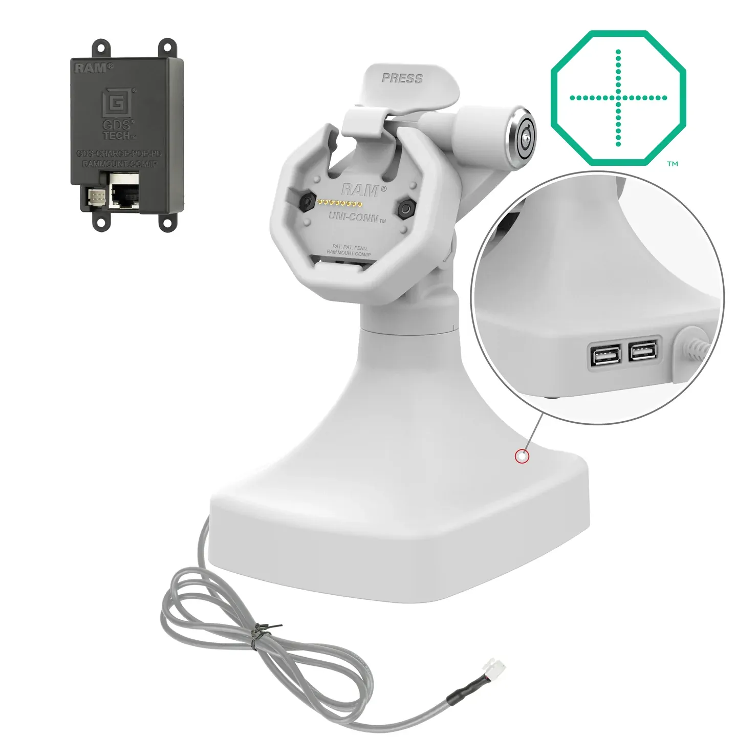 The GDS Uni-Conn Powered Locking Tilt & Swivel Dock with PoE + Data - Gray (RAM-GDS-DOCKLR-D14-U3E-2A-GRY) is a free-standing, powered dock for devices enclosed in an IntelliSkin Thin-Case with Rear Pogo Pads. This solution can swivel 180 degrees and allows devices to tilt 180 degrees, ideal for customer-centric industries like retail, hospitality, food service, and more. Easily dock and undock your device with the assistance of the mechanical attachment mechanism. Power over Ethernet is provided to the pogo pins integrated into the GDS Uni-Conn adapter via RJ45 connection while the two USB-A ports on the back support up to two input devices like keyboard, mouse, scanner gun, and more. This dock features a weighted base and rubber pads that offer theft deterrence and prevent it from sliding around on surfaces. Keep your device safe in high-traffic environments with the key lock, integrated to provide additional theft deterrence. The light gray aesthetic is ideal for sophisticated, bright workplaces.
