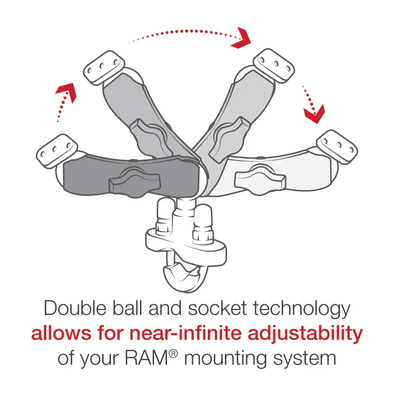 The RAM Quick-Grip Handlebar Mount consists of a zinc coated u-bolt base, double socket arm and spring loaded cradle for supporting most phones. Included in this package is hardware that will accommodate rails from 0.50" to 1.25" in diameter. The base includes black cover caps to be placed over the exposed ends of the u-bolt. The included composite rail adapter can narrow the rail to a minimum width of 0.5". The mount is designed with a RAM 1" diameter patented rubber ball and socket system that has adjustment points at both ends of the double socket arm; this allowing for almost infinite adjustment and perfect viewing angles.