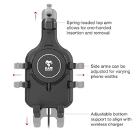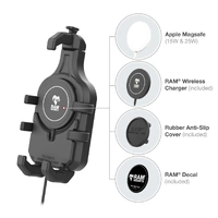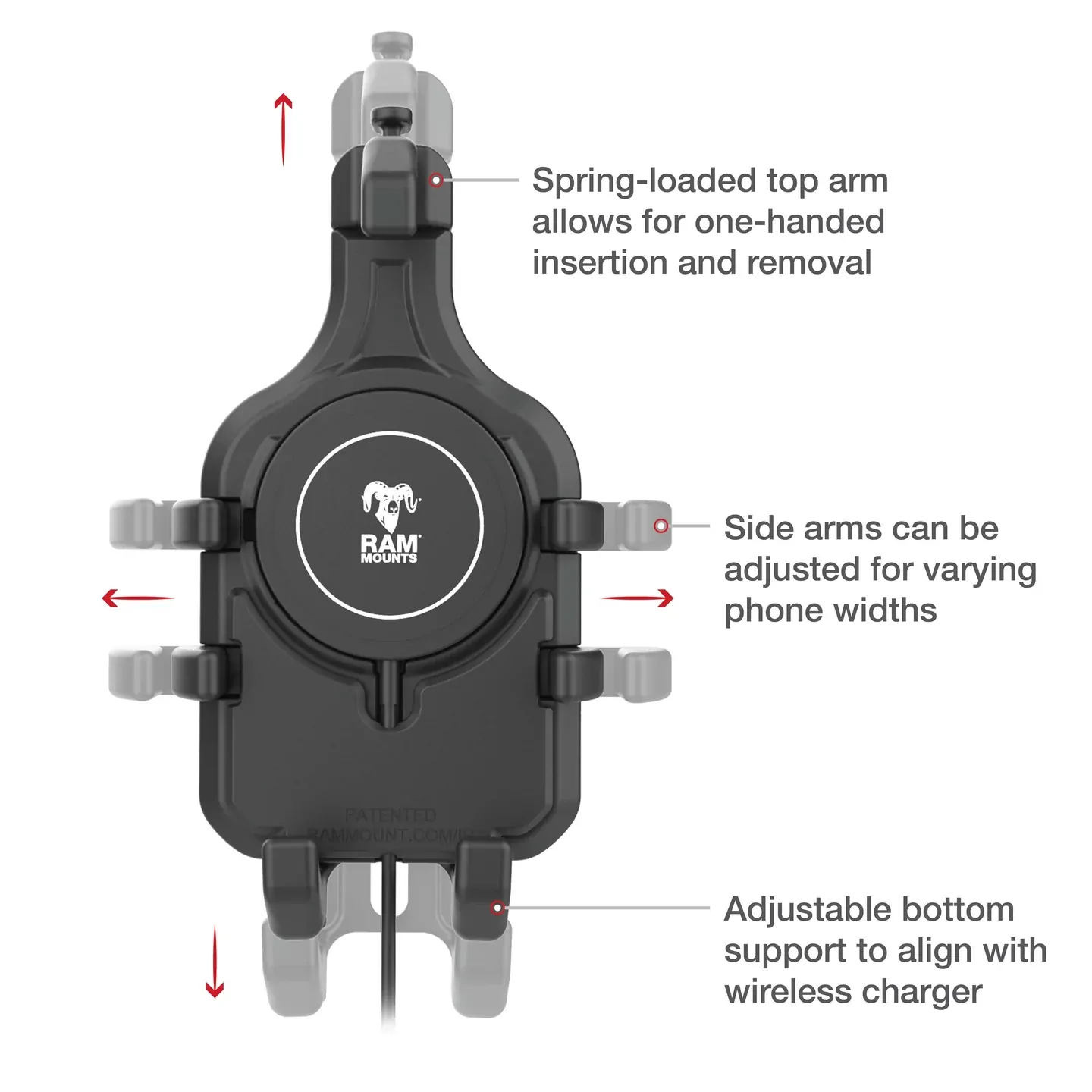 The RAM Quick-Grip Pro Suction Cup Mount with Qi2 15W Wireless Charger (RAM-B-166-PD5-W2MU) is ideal for vehicle windshields and features the next evolution of the RAM Quick-Grip series. This phone holder comes with the RAM Qi2 wireless charger and features an integrated cavity to secure it in place. This phone holder comes with an anti-slip cover ensuring a flush fit when the wireless charging puck is not installed. The RAM Quick-Grip Pro features a spring-loaded design that allows easy one-handed insertion and removal of your phone. The adjustable side arms ensure that your phone will remain secured in the holder without blocking any ports or buttons. This kit includes a 3.3" diameter RAM Twist-Lock suction cup base that easily installs onto any non-porous surface. RAM recommends installing the provided device tether when this holder is used in a vehicle with an open cockpit. It is important to verify the dimensions of your handheld device with its case, sleeve, or skin when determining the overall size.