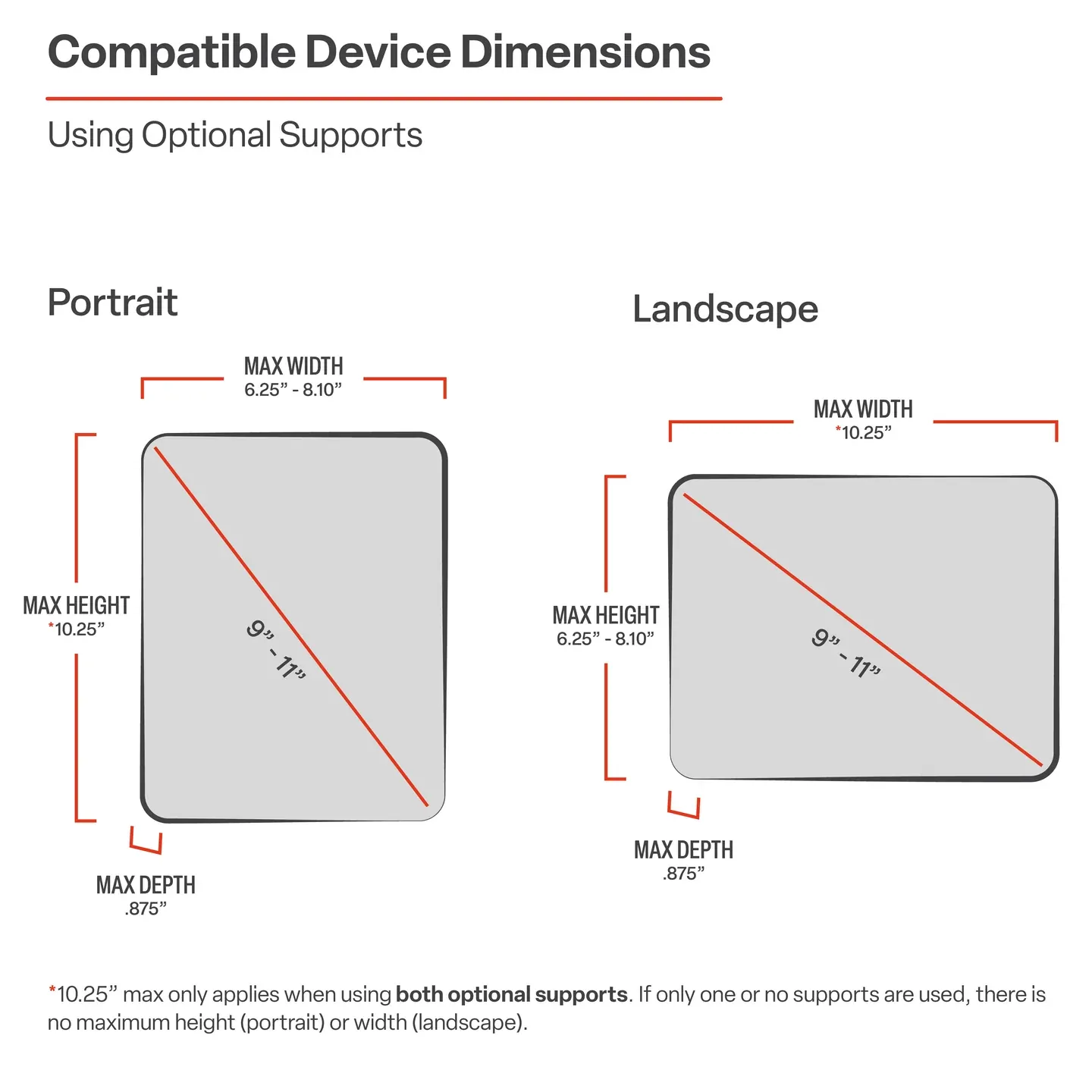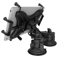 The RAM-B-189-PIV1-A-UN9U consists of a dual articulating 3.3" twist lock suction cup base, short length double socket arm, and universal X-Grip cradle for 9"-11" tablets. The dual articulating suction cup base is an amazing innovation in suction cup mounting. With the ability to independently articulate each suction cup, this mounting base can be used in a variety of applications such as curved windows and surfaces. Included are extra easy access grip knobs, located on the back of the cradle for quick release of your tablet. The X-Grip cradle is compatible with devices that will fit the dimensions listed below. It is important to verify the dimensions of your handheld device with a case/sleeve/skin when determining the overall size.