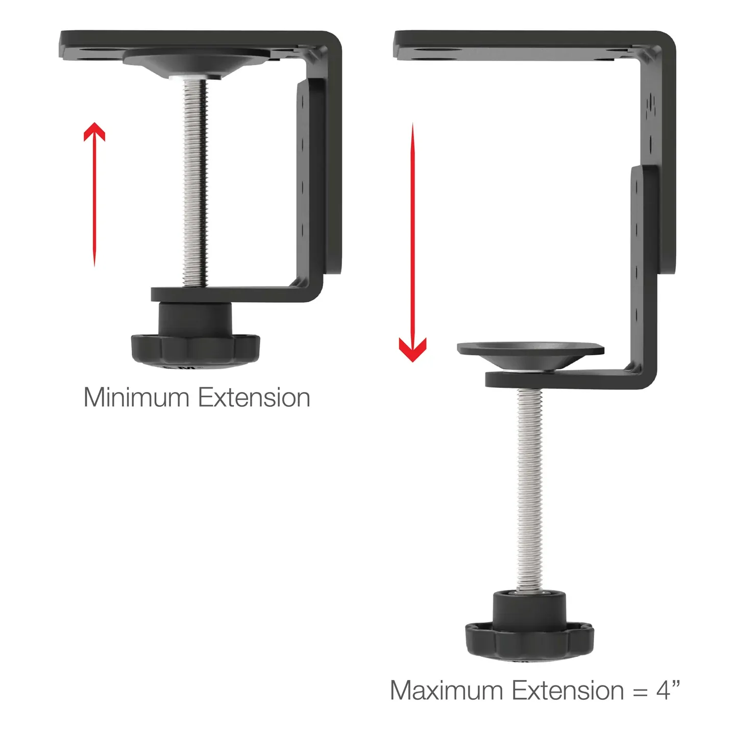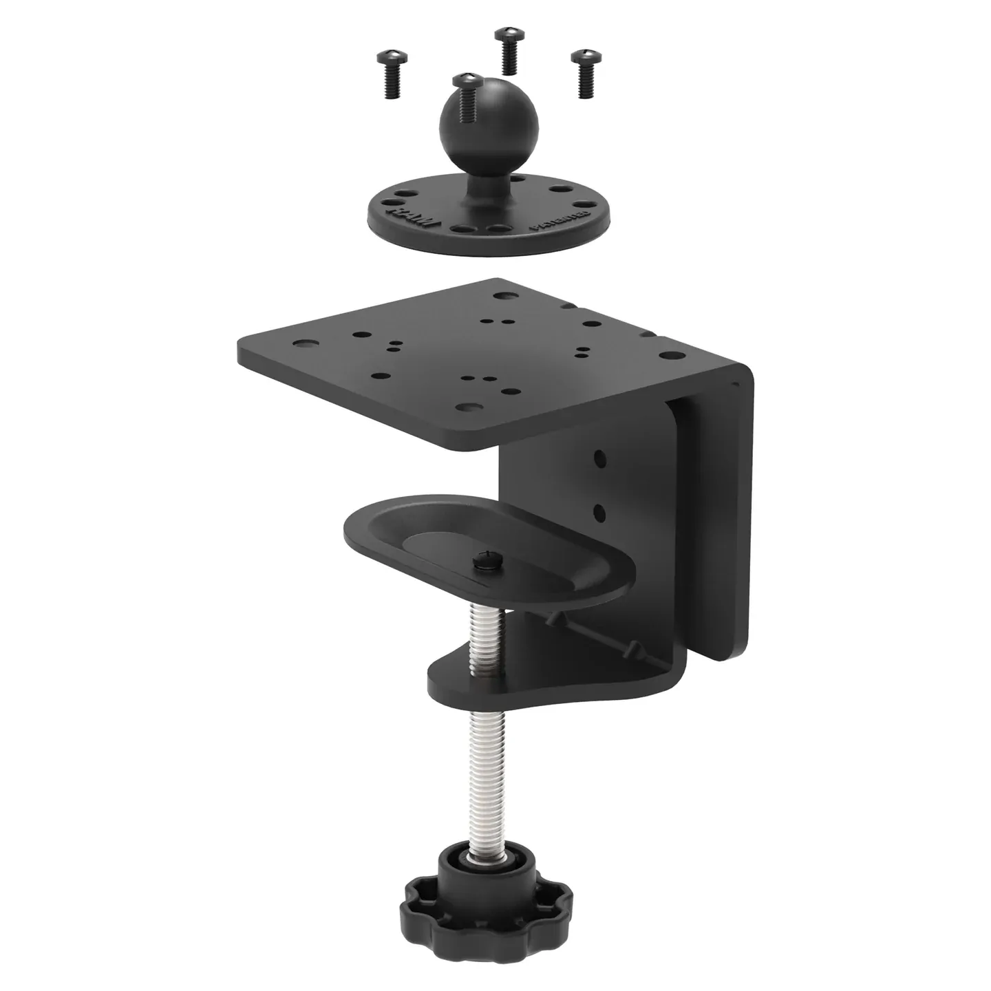 The RAM Heavy Duty C-Clamp Base with B Size Ball (RAM-B-202U-CC1) is a rugged, steel clamp mount designed for flexible, non-permanent device installation across a wide variety of workspaces. Ideal for desks, tables, carts, or mobile stations, this clamp secures firmly to surfaces ranging from 0" up to 4" in thickness-no minimum edge depth required. Built for durability, the all-steel construction delivers long-lasting performance, while the padded interior safeguards mounting surfaces from scuffs or scratches. Whether in industrial settings or professional offices, this clamp provides a secure hold without compromising aesthetics. This heavy-duty desk clamp includes a B size RAM ball base for mounting your desired device holder. Additionally, a 4-hole AMPS pattern is located on the side of the clamp, providing a convenient mounting point for smaller mounting solutions like phones, tablets, scanners, and more. With its durable construction and multiple compatibility options, this C-clamp base supports everything from lightweight tablet mounts to heavy-duty docking stations. The tool-less adjustment knob allows for fast installation and easy removal, making it perfect for temporary workstations, demo stations, or environments where adaptability is key.