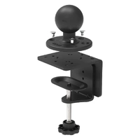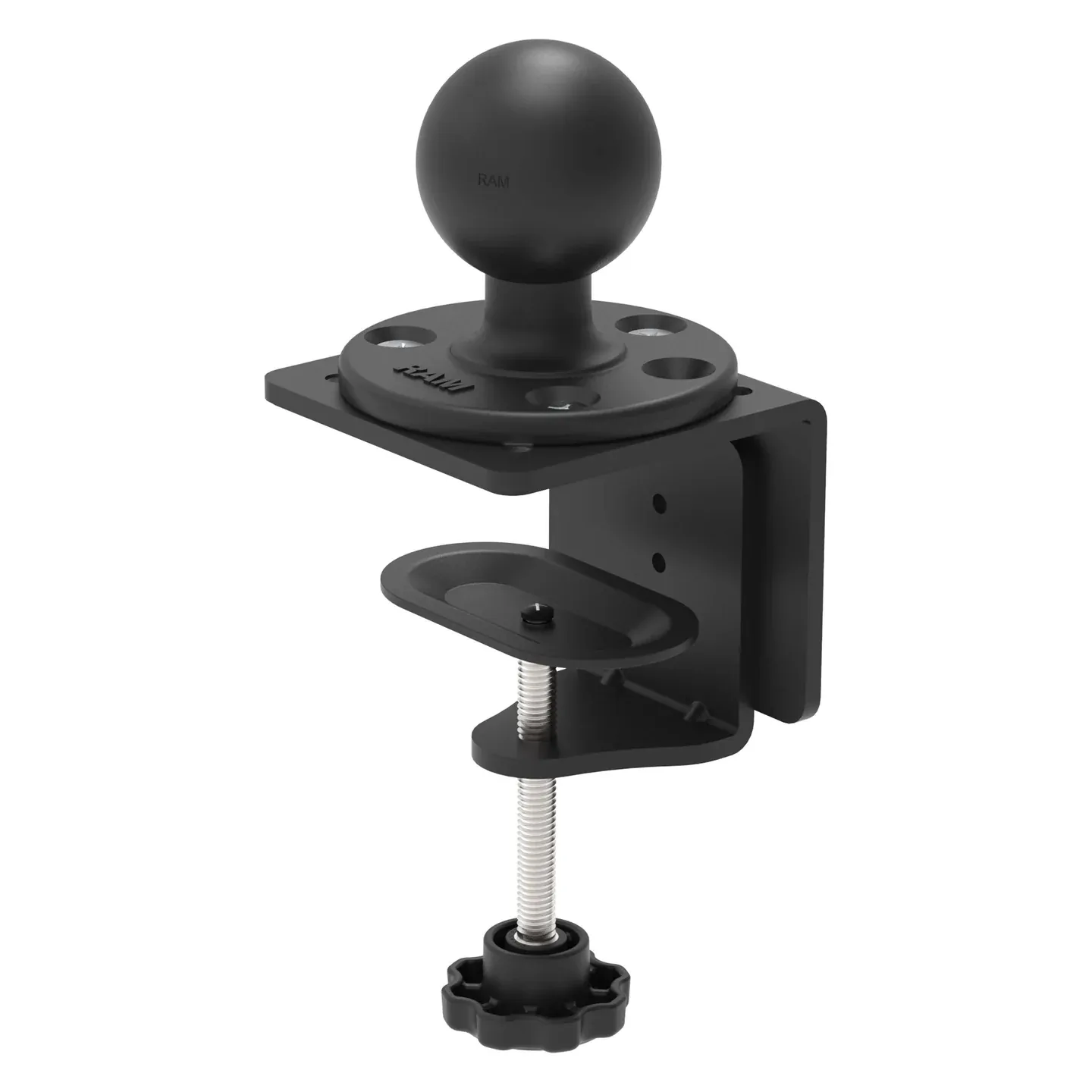 The RAM Heavy Duty C-Clamp Base with D Size Ball (RAM-D-202U-CC1) is a rugged, steel clamp mount designed for flexible, non-permanent device installation across a wide variety of workspaces. Ideal for desks, tables, carts, or mobile stations, this clamp secures firmly to surfaces ranging from 0" up to 4" in thickness- no minimum edge depth required. Built for durability, the all-steel construction delivers long-lasting performance, while the padded interior safeguards mounting surfaces from scuffs or scratches. Whether in industrial settings or professional offices, this clamp provides a secure hold without compromising aesthetics. This heavy-duty desk clamp includes a D size RAM ball base for mounting your desired device. Additionally, a 4-hole AMPS pattern is located on the side of the clamp, providing a convenient mounting point for smaller mounting solutions like phones, tablets, scanners, and more. With its durable construction and multiple compatibility options, this C-clamp base supports everything from lightweight tablet mounts to heavy-duty docking stations. The tool-less adjustment knob allows for fast installation and easy removal, making it perfect for temporary workstations, demo stations, or environments where adaptability is key.