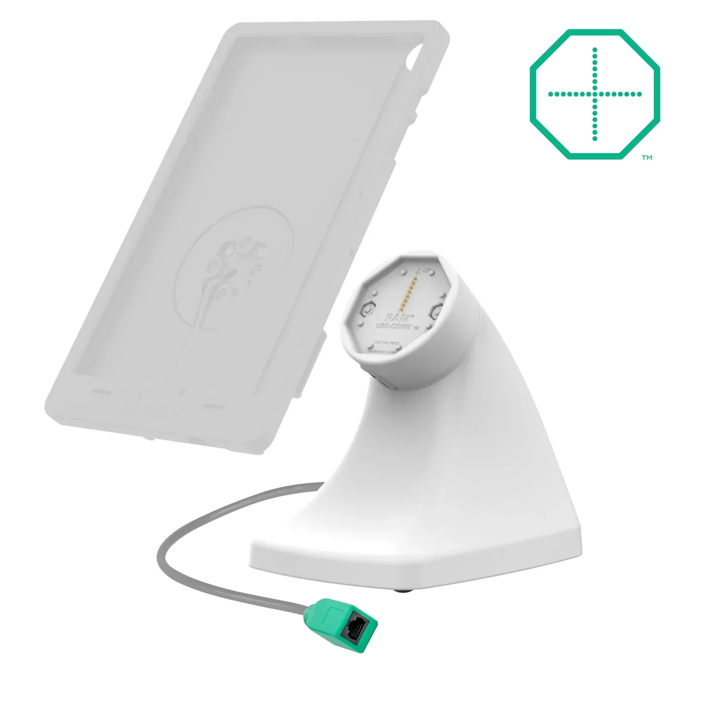 The GDS Uni-Conn Powered Kiosk Dock with PoE - Gray (RAM-GDS-DOCK-D10K-POE-GRY) is a free-standing, powered dock with ethernet capabilities for devices enclosed in an IntelliSkin Thin-Case with Rear Pogo Pads. Easily dock and undock your device with the assistance of the magnetic attachment mechanism. Power is provided to the pogo pins integrated into the GDS Uni-Conn adapter via RJ45 (ethernet) connection. The PoE connection also allows businesses to push updates securely during downtime. This dock features a weighted base and rubber pads that provide theft deterrence and prevent it from sliding around on surfaces. The light gray aesthetic is ideal for sophisticated, bright workplaces.