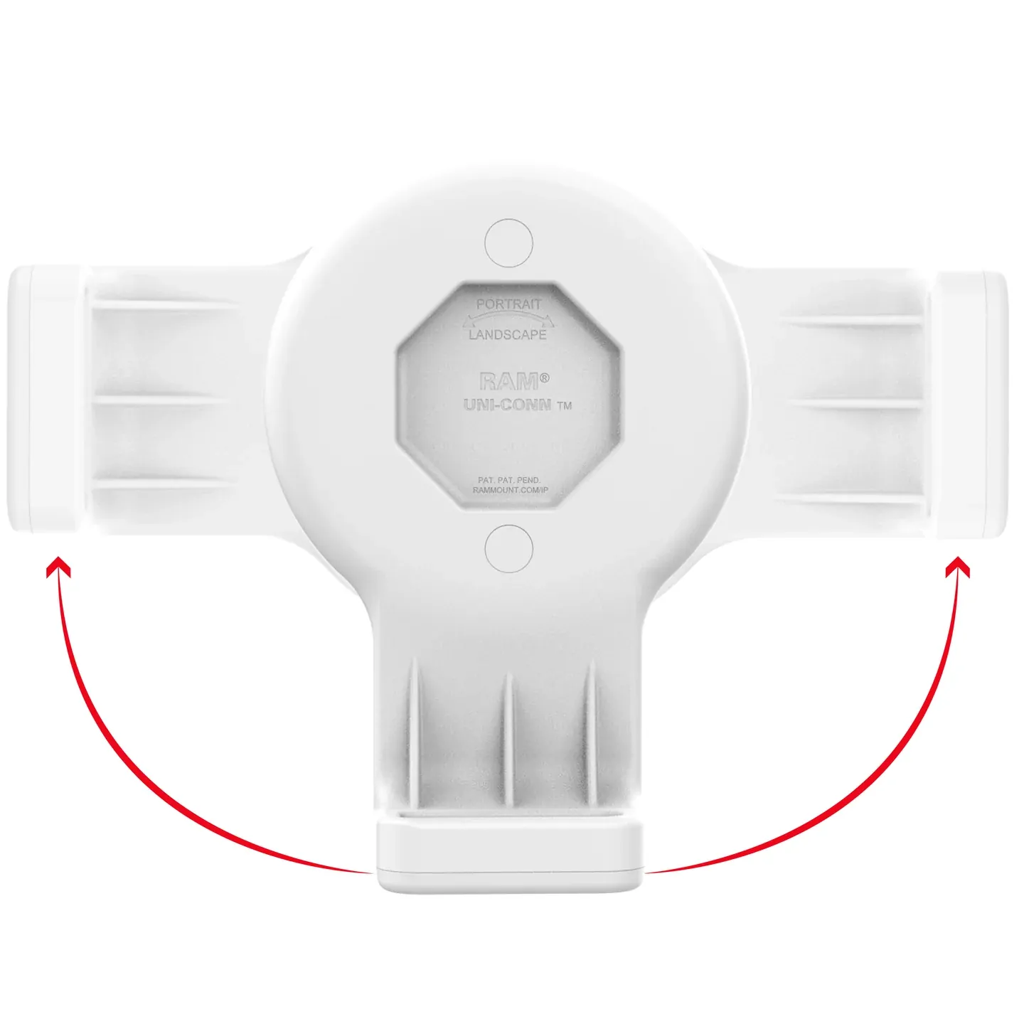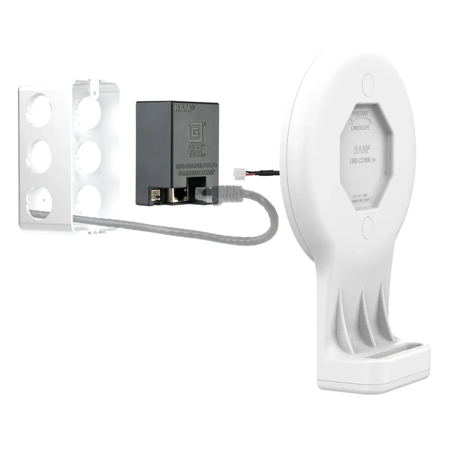 The GDS Uni-Conn Wall Dock with Magnetic Receiver & PoE - Gray (RAM-GDS-DOCK-W3-POE-GRY) is an adjustable wall dock that swivels 180 degrees to enable landscape and portrait mounting. This dock is designed for devices enclosed in an IntelliSkin Thin-Case. Easily dock and undock your device with the assistance of the magnetic attachment mechanism. Power over Ethernet (PoE) is provided to the pogo pins integrated into the GDS Uni-Conn adapter via RJ45 (Ethernet) connector. This dock installation requires a standard rectangle electrical outlet box (not included). The light gray aesthetic is ideal for sophisticated, bright workplaces in industries such as retail, medical, and more.