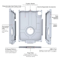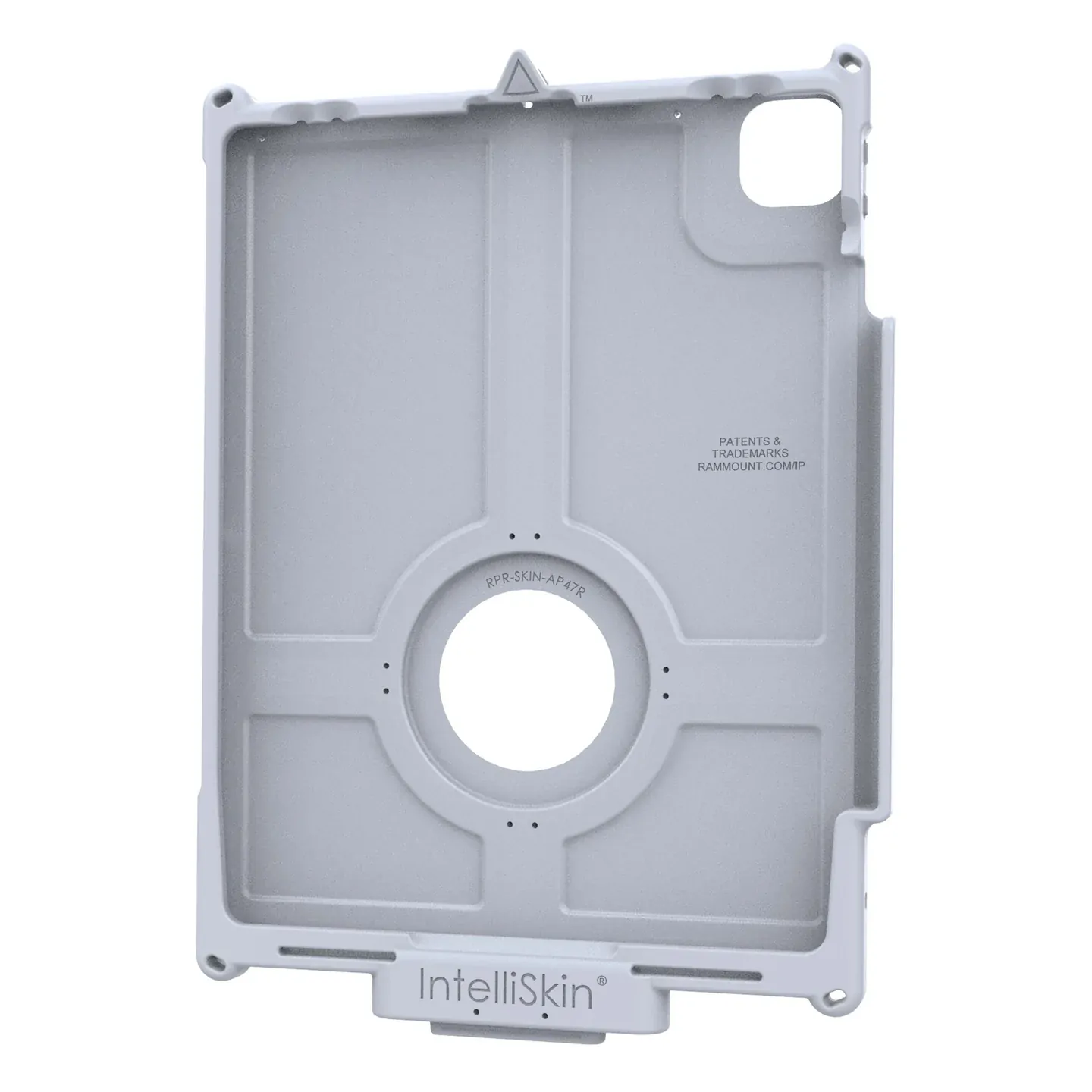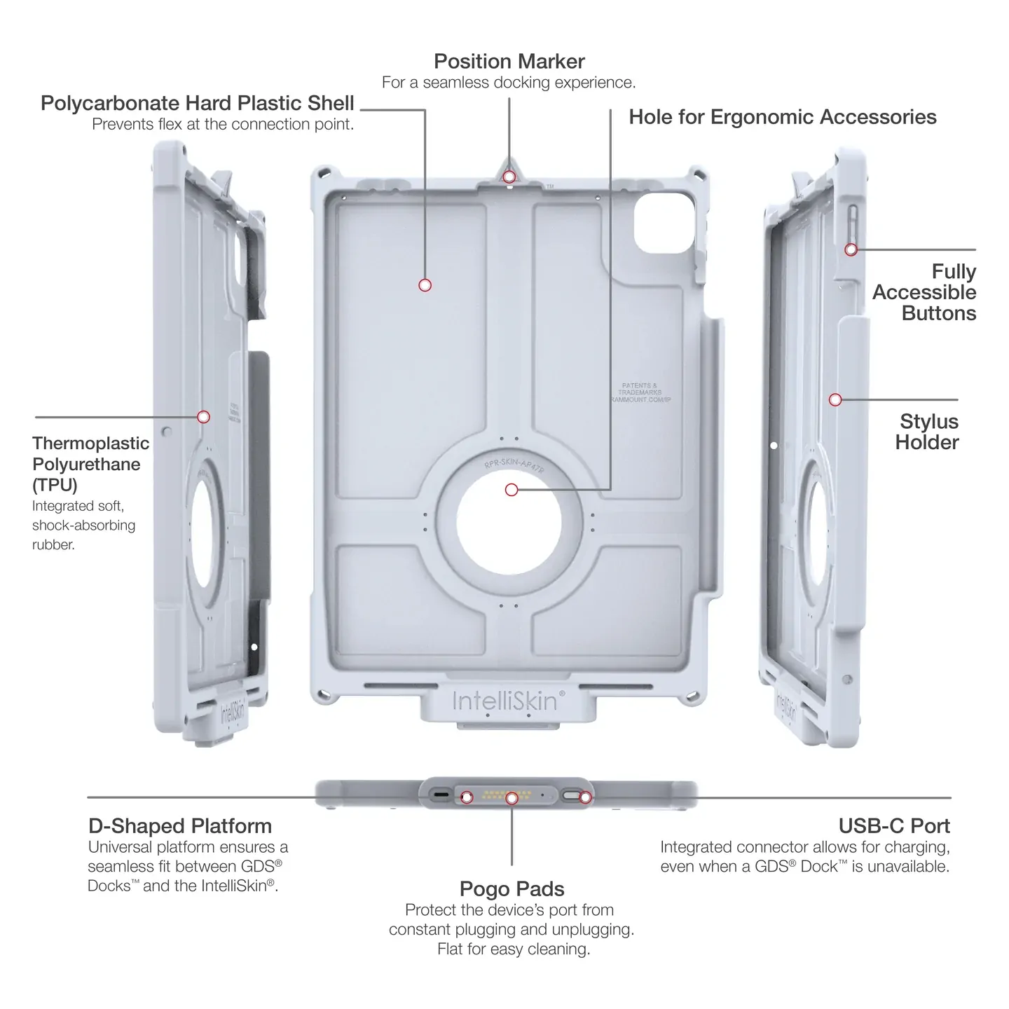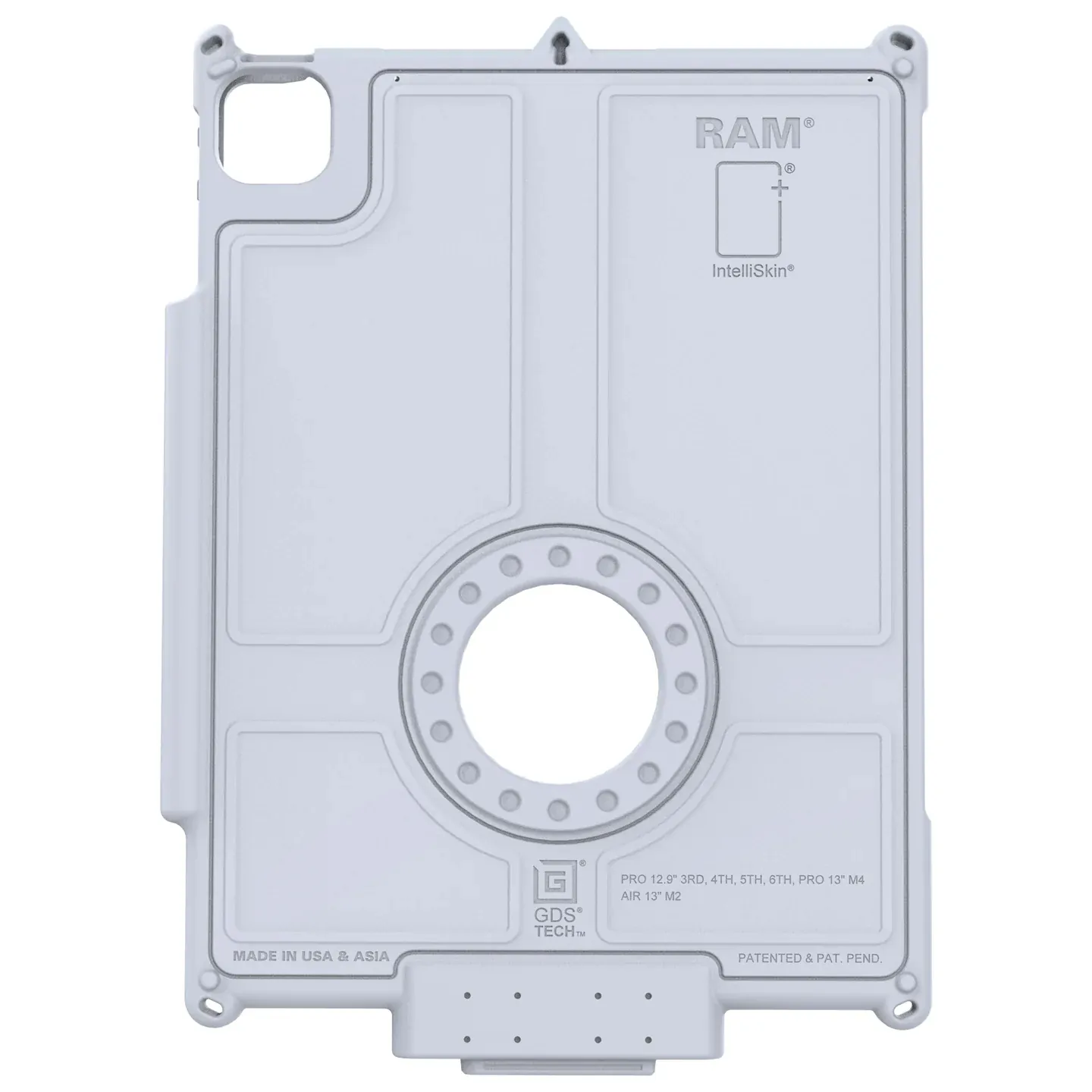 The IntelliSkin Next Gen for iPad Pro 13 (M4), Air 13 & Pro 12.9 - Gray (RAM-GDS-SKIN-AP47-NG-GRY) is a protective sleeve that combines a hard plastic shell with soft, shock-absorbing rubber. It features an integrated GDS connector molded directly into the skin, which prevents damage to your device's charging port from repetitive docking. The flat, ruggedized contacts on the connector collect less dirt and are easier to clean. The integrated connector also has a USB Type-C port that bypasses the pogo pads to charge the device when you don't have a GDS Dock available. It comes with a protective cap for the USB-C port, ensuring debris does not build up over time in field applications. This sleeve provides military-grade drop protection and is compatible with a variety of GDS Docks and accessories. The light gray color not only blends well into professional and industrial settings but also adds a clean, modern aesthetic.