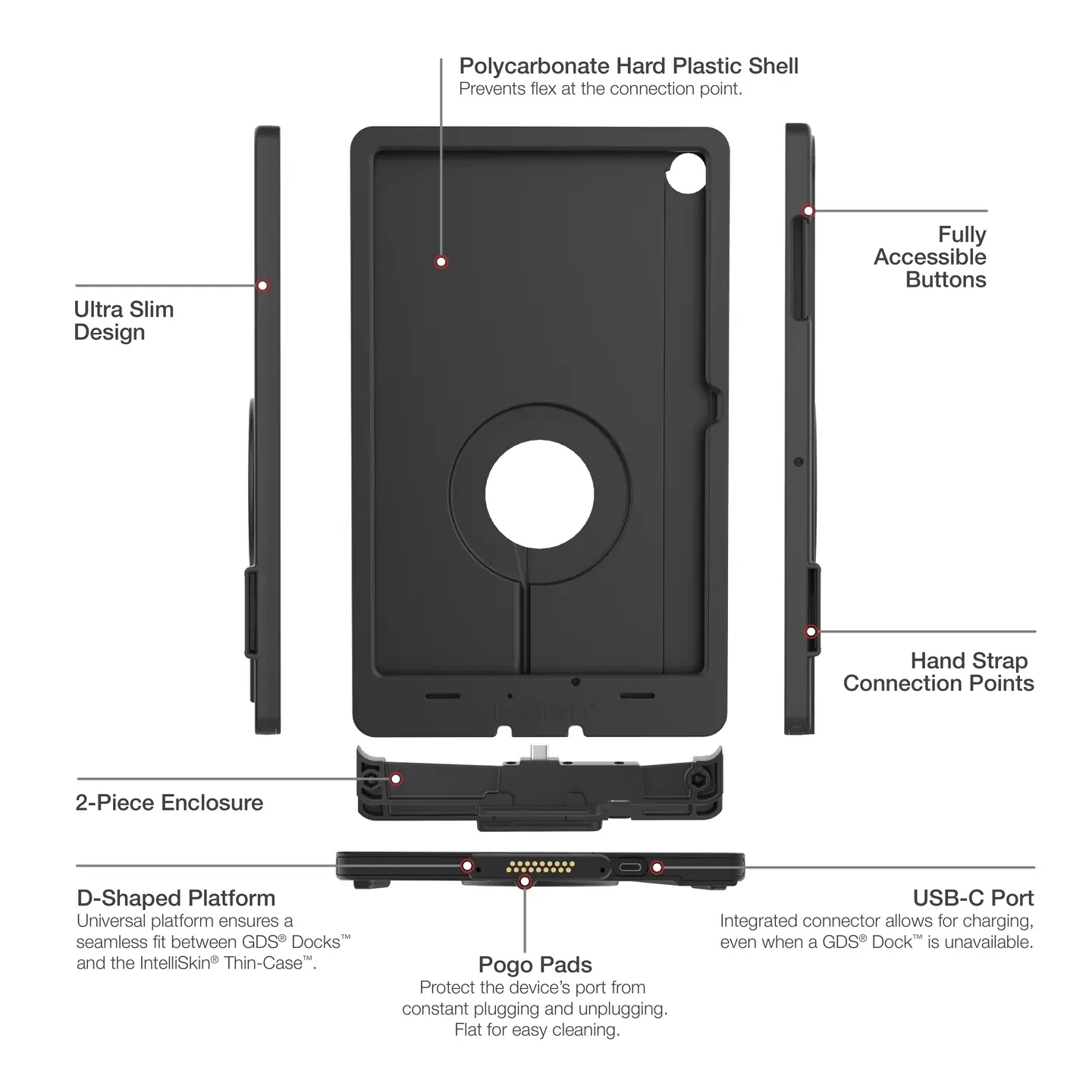 The IntelliSkin Thin-Case for Samsung Tab A11+ (RAM-GDS-SKIN-SAM88-TCD-1) is a low-profile, two-piece device enclosure designed for the GDS Uni-Conn docking platform. The case features the Distinctive D-Shape integrated USB-C connector with external pogo pads. The robust polycarbonate shell protects your device from daily wear and tear while the complete enclosure makes it difficult for unauthorized users to access the tablet, providing additional peace of mind for tablets mounted in high-traffic environments. The flat, ruggedized pogo pad contacts are made for repetitive docking to protect the device's port and collect less dirt making them easier to clean. An integrated USB Type-C connector at the bottom of the case allows for device charging even when you don't have a GDS Dock available. Always Protected. Always Connected.