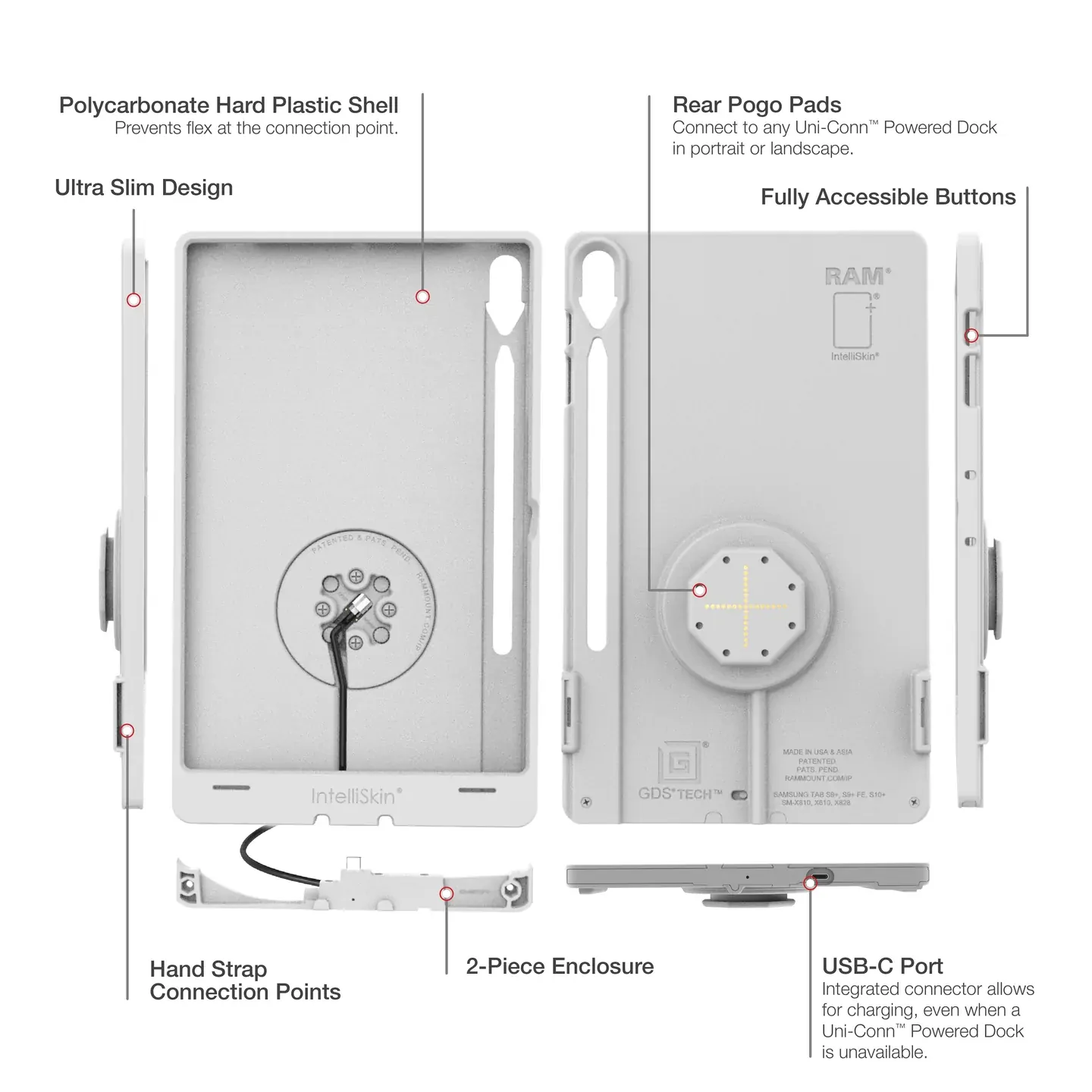 The IntelliSkin Thin-Case for Tab S10+, S9+ & S9 FE+ (Rear Pads) - Gray (RAM-GDS-SKIN-SAM96-TCB-GRY) is a low-profile, two-piece device enclosure designed for the GDS Uni-Conn docking platform. The GDS connection style integrates a USB-C connector that routes through the case to the pogo pads integrated into the GDS Uni-Conn adapter. The robust polycarbonate shell protects your device from daily wear and tear while the complete enclosure makes it difficult for unauthorized users to access the tablet, providing additional peace of mind for tablets mounted in high-traffic environments. The flat, ruggedized pogo pad contacts are made for repetitive docking to protect the device's port and collect less dirt making them easier to clean. An integrated USB Type-C connector at the bottom of the case allows for device charging even when you don't have a GDS Powered Uni-Conn Dock available. The light gray aesthetic is ideal for sophisticated, bright workplaces in industries such as retail, medical, and more. The IntelliSkin Thin-Case for the Samsung Tab S9+ & S9 FE+ is only compatible with GDS Powered Uni-Conn docks, easily identified by the GDS Powered Uni-Conn Adapter emblem.