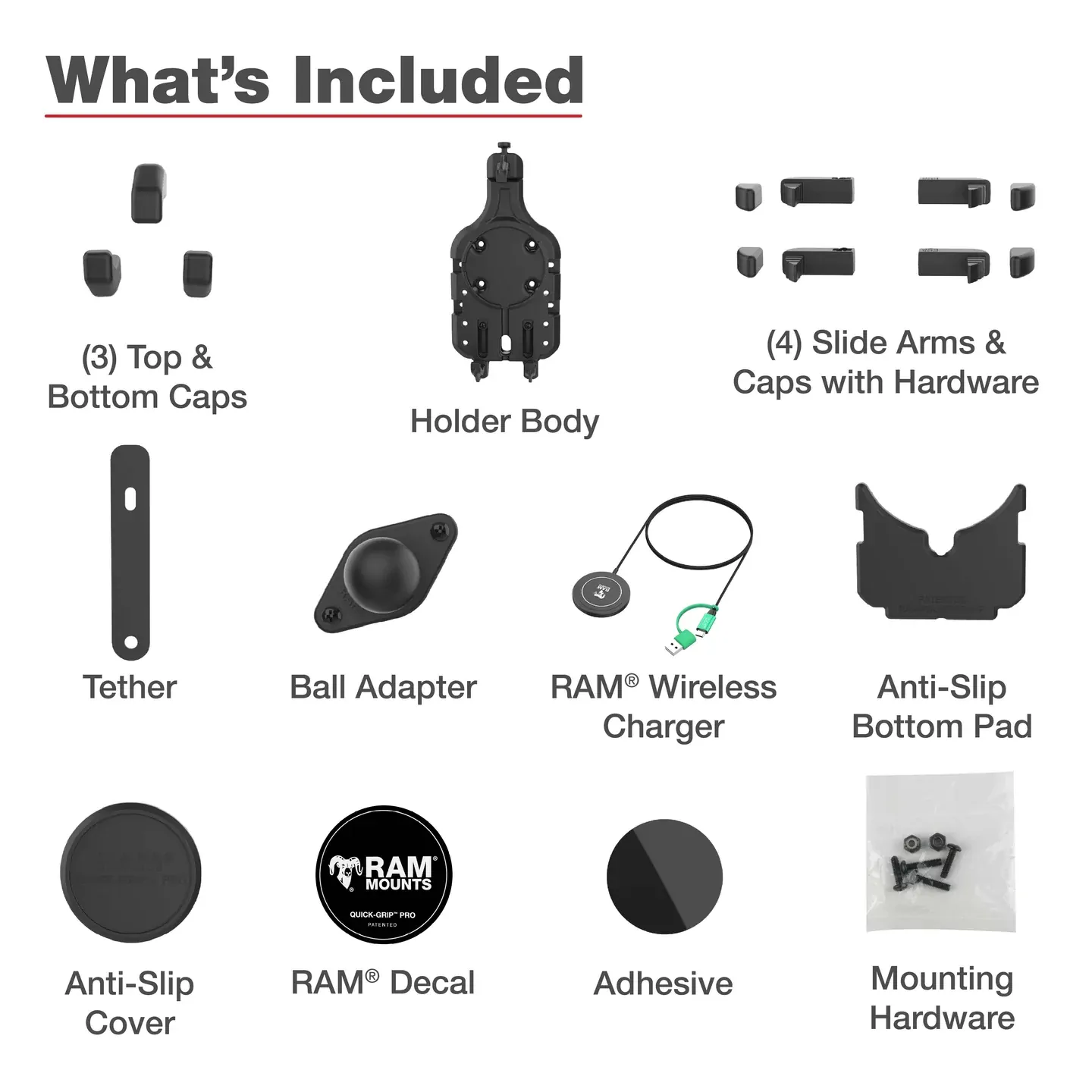 The RAM Quick-Grip Pro with Ball & Qi2 15W Wireless Charger (RAM-HOL-PD5B-W2MU) is the next evolution of the RAM Quick-Grip series. Re-designed with a new, sleek look and integrated rubber side arms to provide a secure, no-slip hold on your phone. This phone holder comes with the RAM Qi2 wireless charger and features an integrated cavity to secure it in place. This phone holder comes with an anti-slip cover ensuring a flush fit when the wireless charging puck is not installed. The RAM Quick-Grip Pro features a spring-loaded design that allows easy one-handed insertion and removal of your phone. The adjustable side arms ensure that your phone will remain secured in the holder without blocking any ports or buttons. Complete the solution by building your mount-this holder is RAM Compatible and includes a B size diamond ball to be installed on the 2-hole AMPS pattern. RAM recommends installing the provided device tether when this holder is used in a vehicle with an open cockpit. It is important to verify the dimensions of your handheld device with its case, sleeve, or skin when determining the overall size.