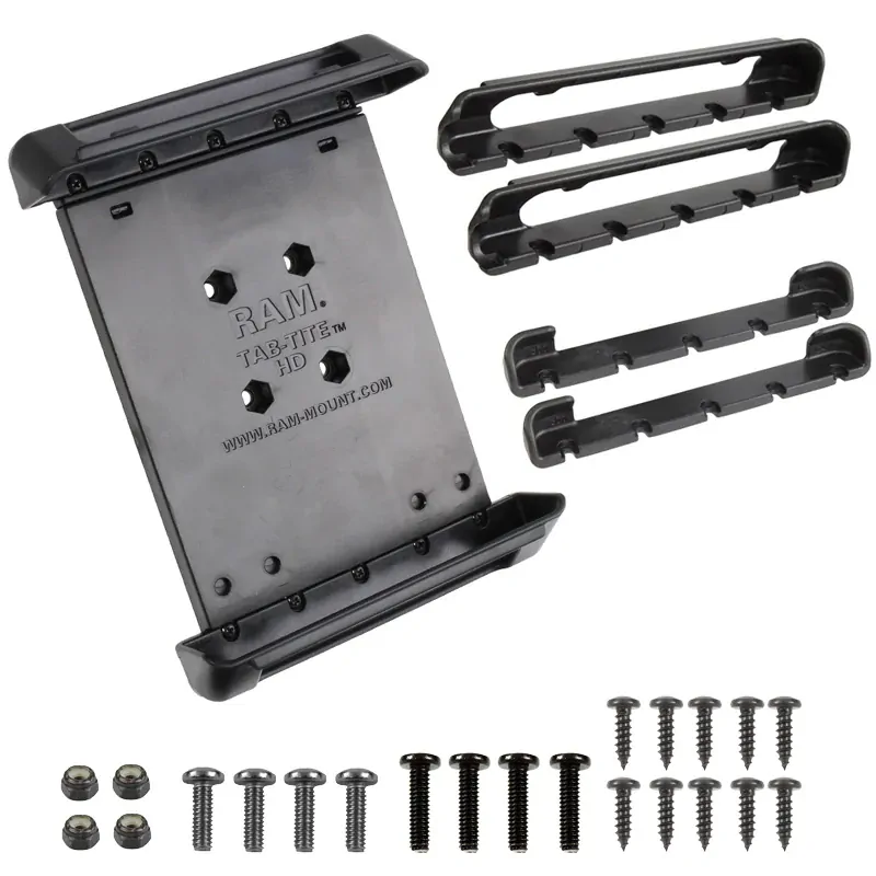 Now that you've got the right Tab for the job, you are going to need the right mounting system. Get the most out of your tablet with the Universal RAM Tab-Tite cradle. With 3 sets of interchangeable cup ends, ranging from different sizes and features, you can fit the cradle to your tablet for a near custom fit. This spring loaded design makes it easy to load and unload your tablet, along with keeping it secure while on the go. Cup ends are designed to optimize the functionality of your tablet, allowing access to audio jacks, usb, power, and other ports, your tablet can be used just as it was intended. Perfect for stationary or on the go applications, this new RAM product is just what you need to get the most out of your mobile device. Included is a set of four nuts and bolts to connect the cradle to any RAM components or mounts that contain the universal AMPs hole pattern. For off-road environments and extreme use, we recommended the use of a tether to assist in retaining your device. The Tab-Tite cradle is compatible with any tablet that will fit the dimensions listed below. It is important to verify the dimensions of your tablet when determining the overall size.