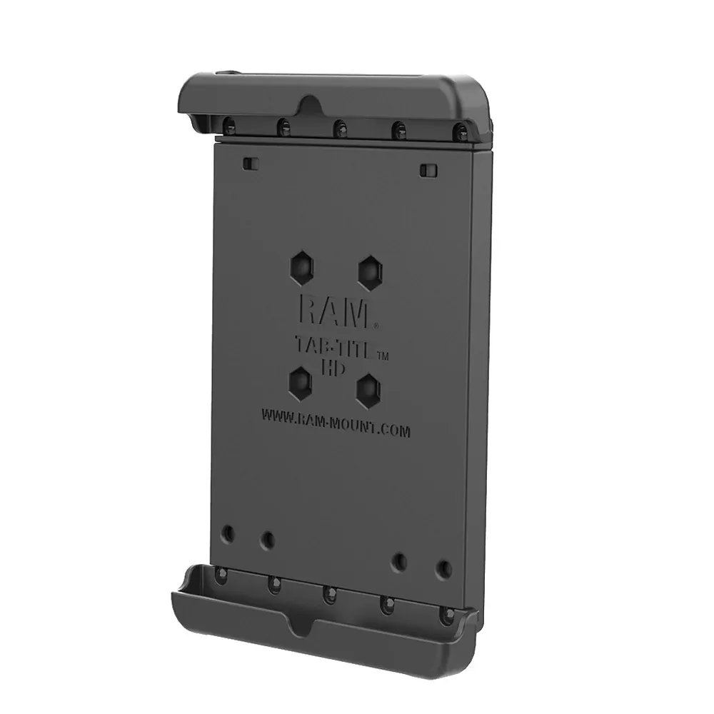 The RAM-HOL-TAB18U consists of a spring loaded back plate and custom support cups for the Google Nexus 7 and the LG G Pad 7.0 WITH OR WITHOUT LIGHT DUTY SLEEVE. The spring loaded design makes it easy to load and unload your tablet, along with keeping it secure while on the go. Interchangeable cup ends are designed to optimize the functionality of your tablet, allowing access to audio jacks, usb, power, and other ports, your tablet can be used just as it was intended. Perfect for stationary or on the go applications, the RAM-HOL-TAB18U is just what you need to get the most out of your tablet. Included is a set of four nuts and bolts to connect the cradle to any RAM components or mounts that contain the universal AMPs hole pattern. For off-road environments and extreme use, we recommended the use of a tether to assist in retaining your device. The Tab-Tite cradle is compatible with any tablet that will fit the dimensions listed below. It is important to verify the dimensions of your tablet when determining the overall size.