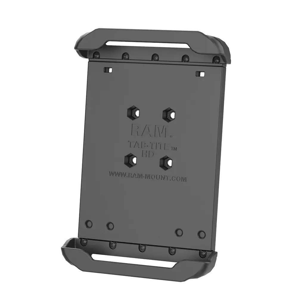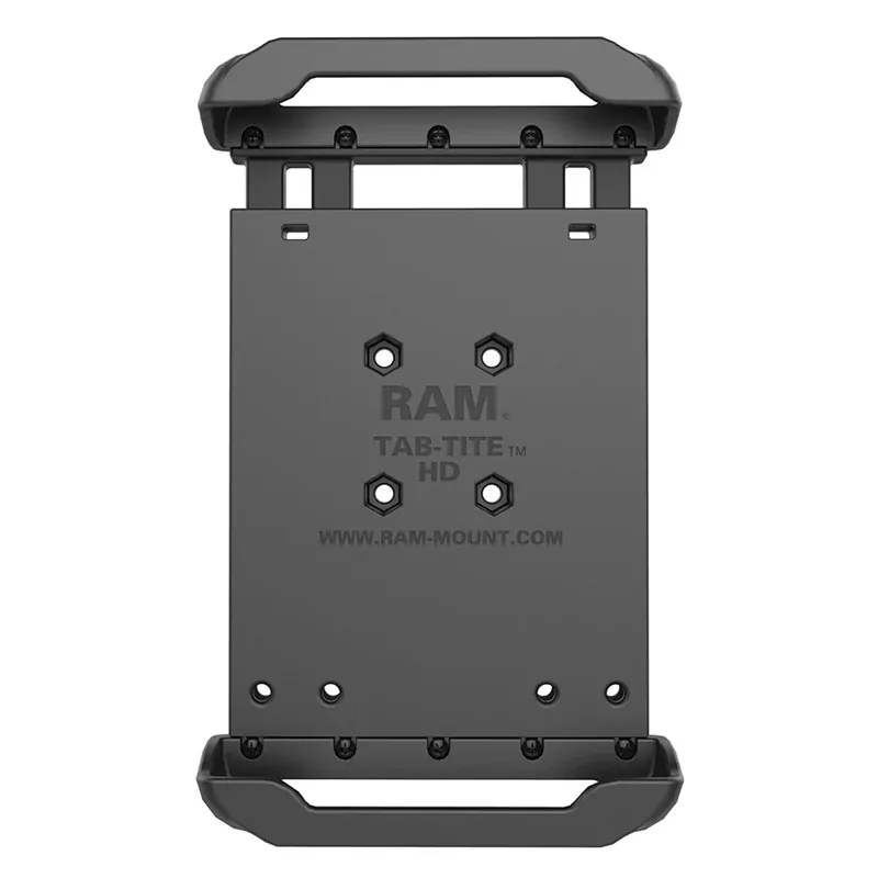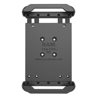 The RAM Tab-Tite spring loaded, quick release cradle offers a secure fit with easy access to the mounted tablet. The interchangeable cup ends are designed specifically for the Samsung Galaxy Tab 4 7.0 with an Otterbox Defender case. The spring loaded design makes it easy to insert and remove your tablet, along with keeping it secure in mobile applications. The custom end cups are designed to optimize the functionality of your tablet, enabling access to all ports and tablet functions. The included back plate is interchangeable with various size support cups, making it compatible with numerous tablet models. New detachable support cups are the only components needed for purchase, attach to the back plate for support of your new tablet. Included is a set of four nuts and bolts to connect the cradle to any RAM components or mounts that contain the universal AMPs hole pattern. For off-road environments and extreme use, we recommended the use of a tether to assist in retaining your device. The Tab-Tite cradle is compatible with any tablet that will fit the dimensions listed below. It is important to verify the dimensions of your tablet when determining the overall size.