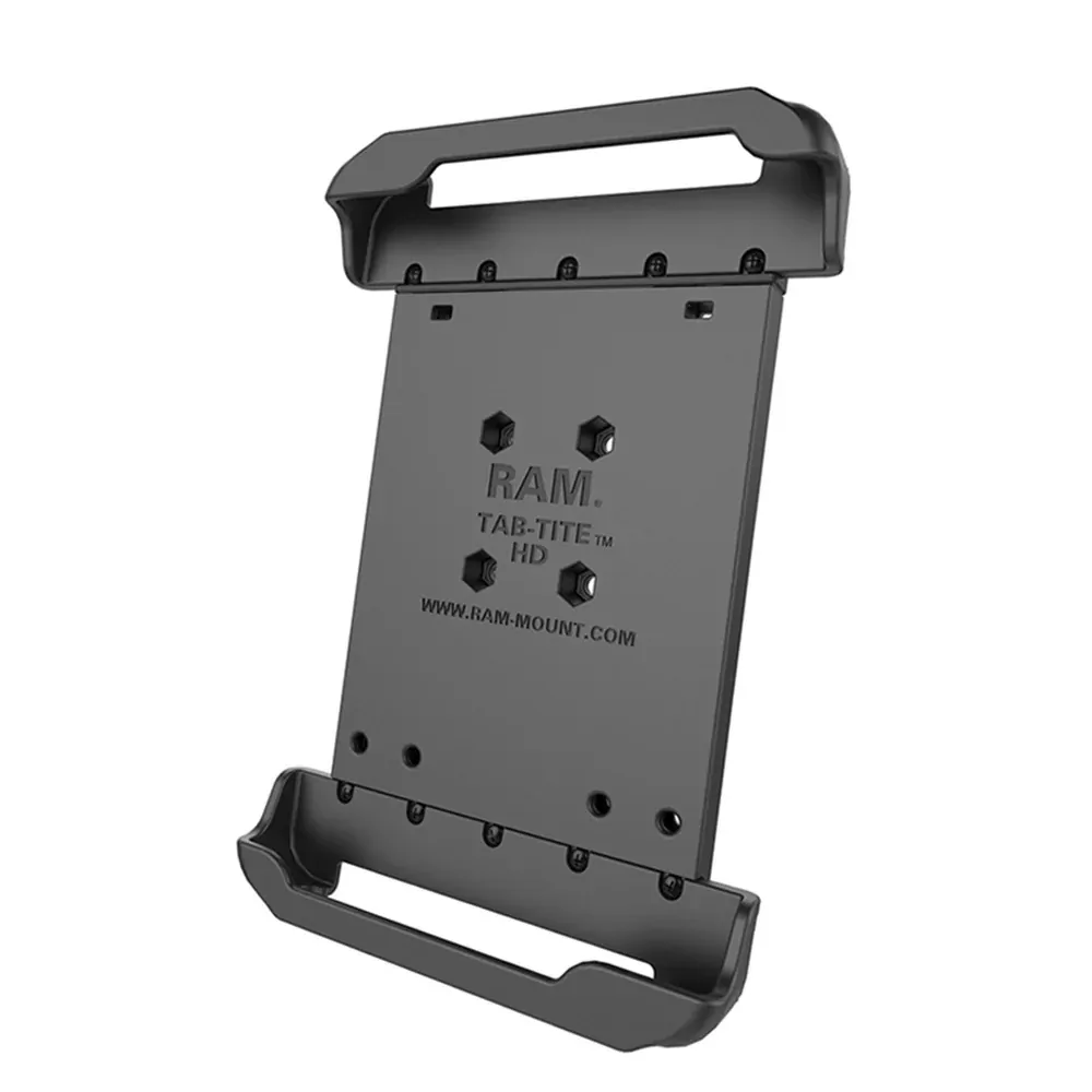 The RAM Tab-Tite spring loaded, quick release cradle offers a secure fit with easy access to the mounted tablet. The interchangeable cup ends are designed specifically for the Samsung Galaxy Tab 4 8.0 and Tab S 8.4 with an Otterbox Defender case. The spring loaded design makes it easy to insert and remove your tablet, along with keeping it secure in mobile applications. The custom end cups are designed to optimize the functionality of your tablet, enabling access to all ports and tablet functions. The included back plate is interchangeable with various size support cups, making it compatible with numerous tablet models. New detachable support cups are the only components needed for purchase, attach to the back plate for support of your new tablet. Included is a set of four nuts and bolts to connect the cradle to any RAM components or mounts that contain the universal AMPs hole pattern. For off-road environments and extreme use, we recommended the use of a tether to assist in retaining your device. The Tab-Tite cradle is compatible with any tablet that will fit the dimensions listed below. It is important to verify the dimensions of your tablet when determining the overall size.