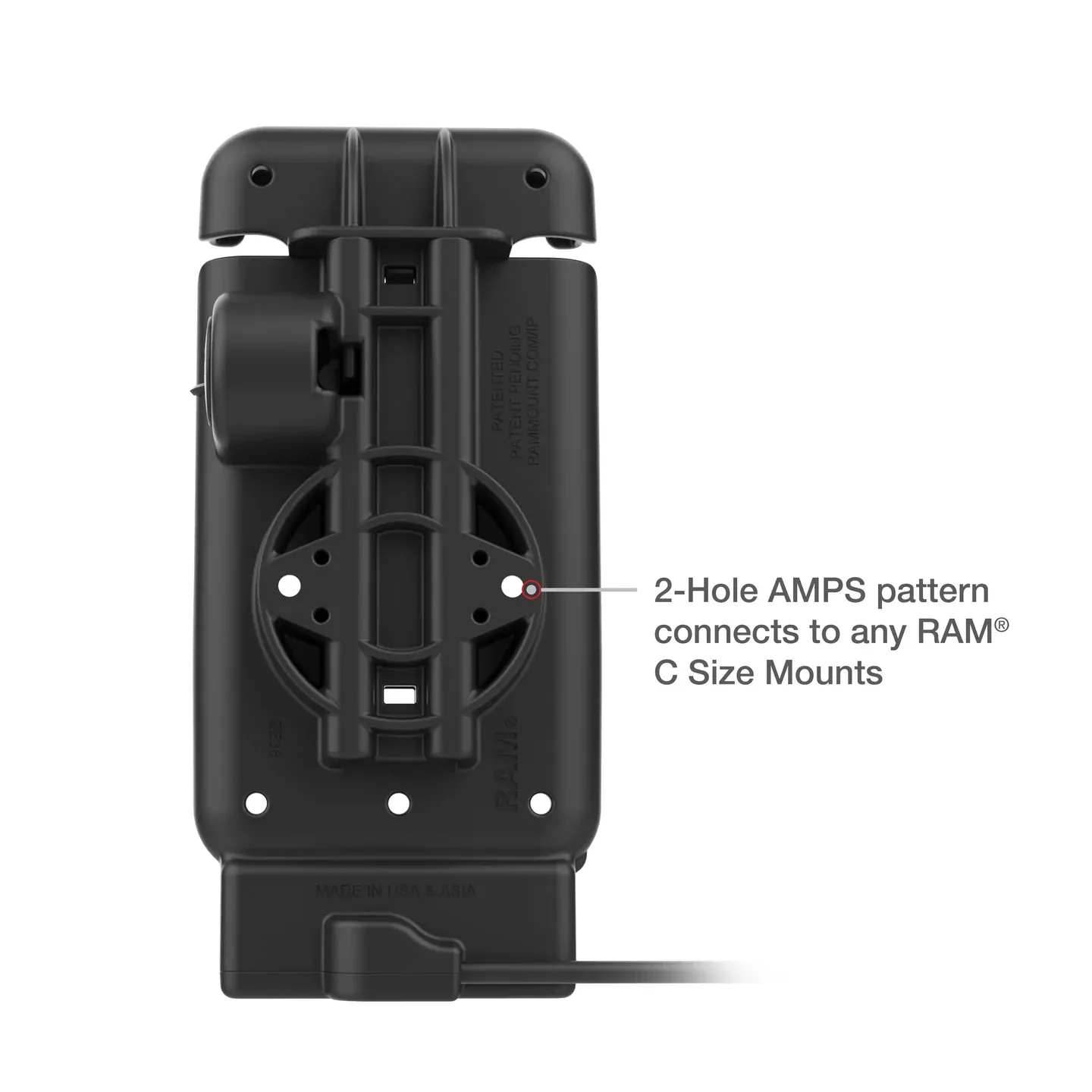 The RAM Vehicle Dock for XCover7 Pro & 6 Pro with Case / RAM Skin (RAM-HOL-V15-SAM84CPU) is a rugged dock that will meet and exceed the demands of modern workflows, featuring a USB-C connection tested for more than 250,000 cycles. The spring-loaded design of this dock allows for a quick one-handed insertion or removal of your device while the precise design of the dock body minimizes human error and port damage when docking the device onto the USB-C male connector. The back cavity of the dock accommodates ergonomic accessories secured to the back of the device. An integrated cutout on the top allows for the ability to access the device's top button without removing the device from the dock. Complete the solution by building your mount - this holder is RAM Compatible featuring a 2-hole AMPS pattern for adding a diamond ball adapter.