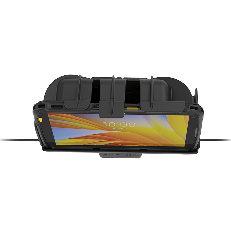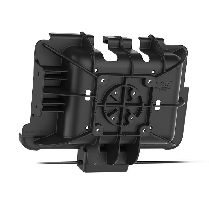 Featuring data and charging capabilities, the RAM Tough-Dock for Zebra ET40 & ET45 10" enterprise tablets with Rugged Frame allows you to connect a desired peripheral while keeping the device charged through the pogo pin contacts when the device is docked. Power is provided by connecting to the dock's 5.5mm DC power jack, while peripheral support is provided by the built-in USB Type A cable. The dock also allows the tablet's scanning function to work on the side, as well as tablet add-ons such as the Zebra Expansion Back and PowerPack Battery. This vehicle dock is compatible with C and D size RAM 4-hole AMPS and 75mm x 75mm VESA pattern bases for attaching a double socket arm in order to complete your mounting solution. Take the solution a step further by taking advantage of the built-in 2-hole mounting plate compatible with RAM 2-hole diamond base for additional device mounting such as a phone or other handheld device.
