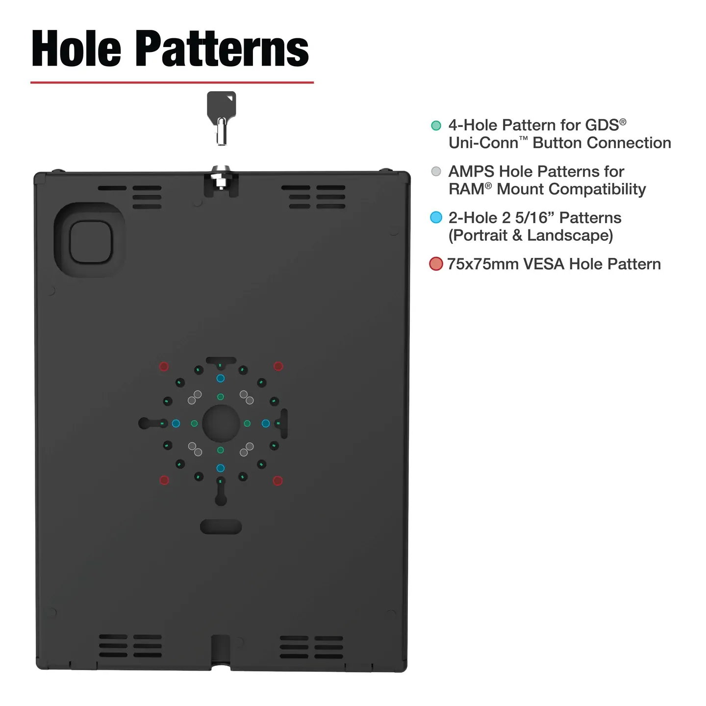 The RAM Safe-Case for iPad Pro 13 (M4), Air 13 (M2 & M3), & Pro 12.9 (RAM-TE-AP47) is a rugged, modular enclosure designed for high-security environments. Built from durable two-piece steel, this key-locking tablet case protects against theft, tampering, and tough environmental conditions - ideal for demanding field or industrial applications. Custom-fit for the 13" iPads features precision cutouts for full access to the device's lock button, USB-C port, and rear camera. Ventilation slots and speaker openings maintain device functionality without compromising protection. The enclosure features versatile mounting options with integrated hole patterns for flush mounting, compatibility with RAM double ball mounts, or 75x75mm VESA stands. For added docking functionality, the Safe-Case supports the installation of a GDS Uni-Conn button - enabling rear pogo pin charging when paired with any compatible GDS dock.