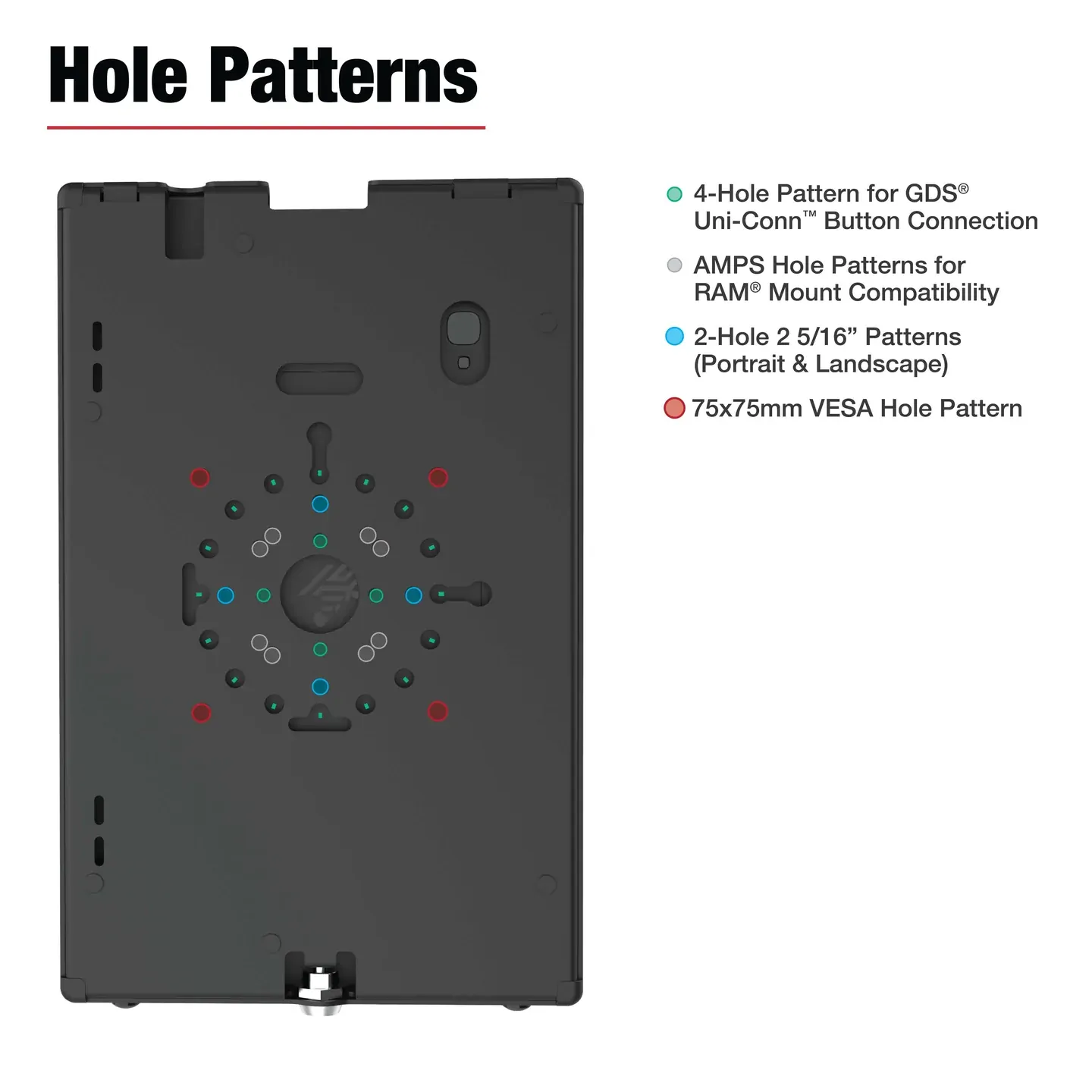 The RAM Safe-Case for Zebra ET4x 8" Tablet (RAM-TE-ZE20) is a rugged, modular enclosure designed for high-security environments. Built from durable two-piece steel, this key-locking tablet case protects against theft, tampering, and tough environmental conditions - ideal for demanding field or industrial applications. Custom-fit for the Zebra ET4x 8", the Safe-Case features precision cutouts for full access to the device's lock button, USB-C port, and rear camera. Ventilation slots and speaker openings maintain device functionality without compromising protection. The enclosure features versatile mounting options with integrated hole patterns for flush mounting, compatibility with RAM double ball mounts, or 75x75mm VESA stands. For added docking functionality, the Safe-Case supports the installation of a GDS Uni-Conn button - enabling rear pogo pin charging when paired with any compatible GDS dock.